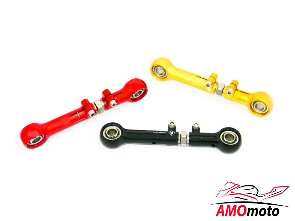 Schnelles Stufenloses Einstellen der Heckhöhe (Progressive version), damit kann das Heck höher eingestellt werden. Vorteil der Schubstange von Ducabike gegenüber der originalen ist, dass man die Verstellung im eingebauten Zustand vornehmen kann. Bei der originalen Schubstange ist die Verstellung ohne Ausbau nicht möglich.Passend für folgende Ducatis: